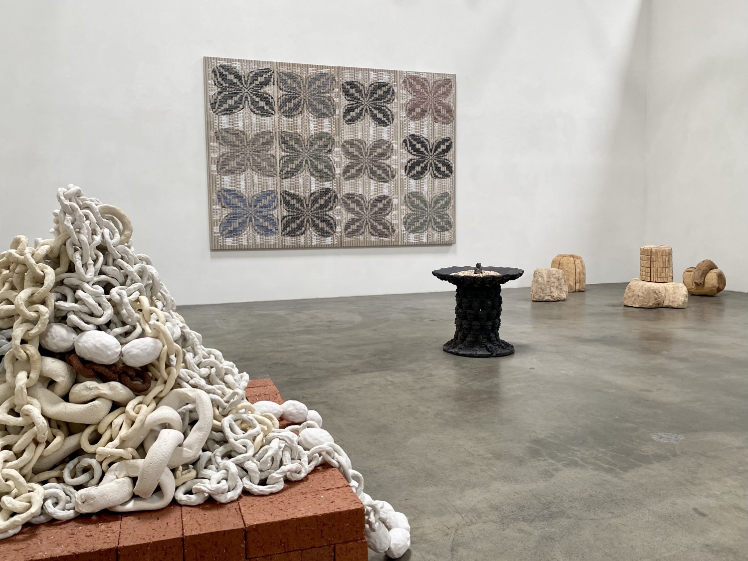 Sappho, the ancient Greek poet, sought to “write words more naked than flesh, stronger than bone, more resilient than sinew, sensitive than nerve.” Analogies between artistic inspiration and human form are equally embodied in the work of the nine LA women in this exhibition. The evidence of their hand is revealed in the use of elemental materials, dichotomies of physical strength and fragility, as well as palpable manifestations of energy. Rope, chain, fiber and fabric are linkages, like nets and networks, combining to form strength in individuals and unity amongst groups, even if those chains are only made of clay.