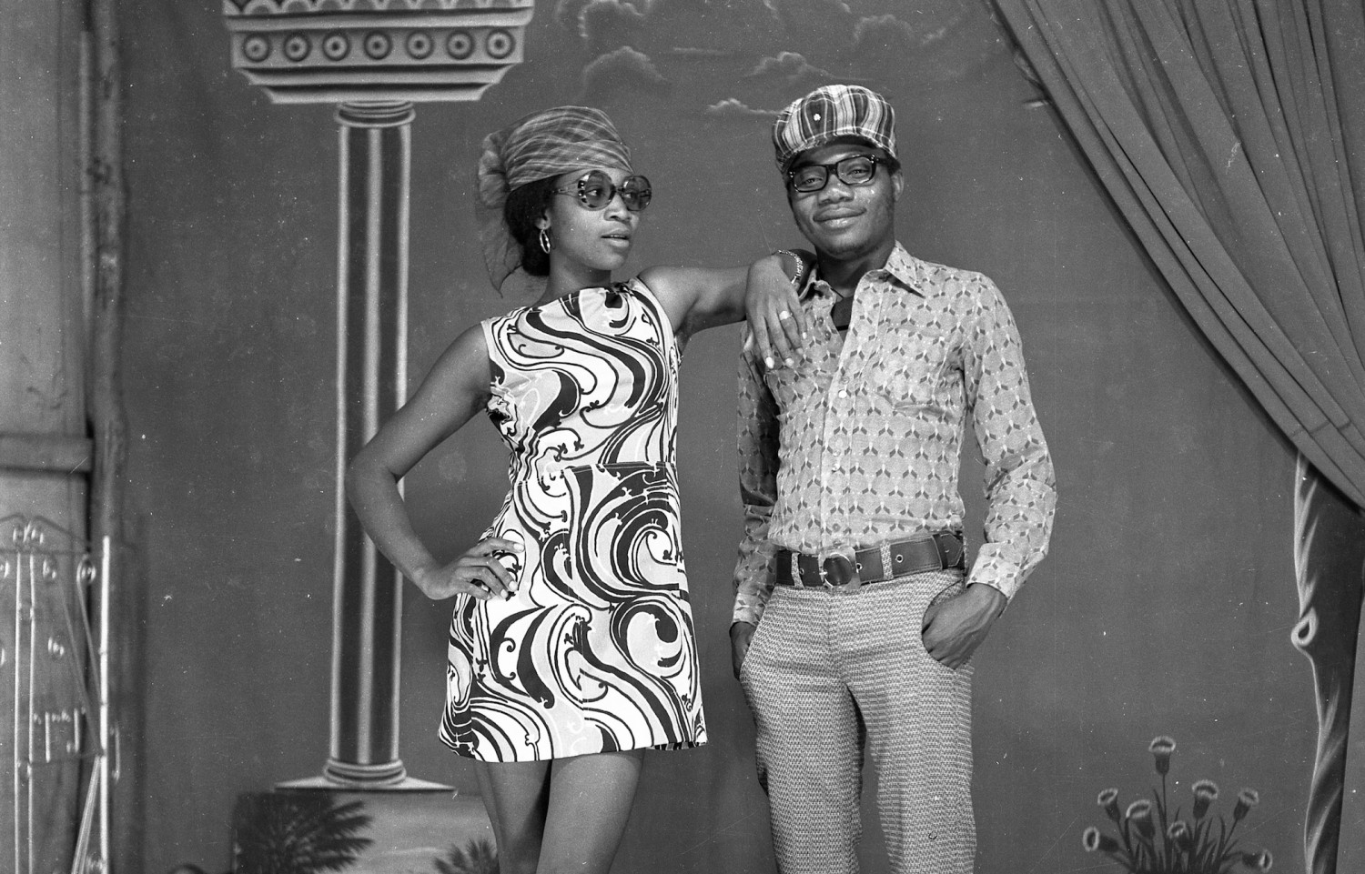 Jacques Toussele (b. Bamessingué, Cameroon, 1939–2017); Emmanuel Lucky Sparrow, the backdrop painter, and his girlfriend; 2021 inkjet print from digital scan of original undated negative; © Jacques Toussele’s Estate